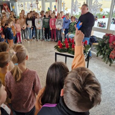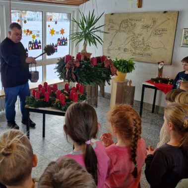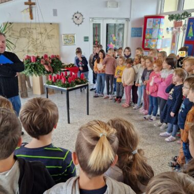 Pfarrer Matthias Nowotny segnete deshalb den prächtigen Adventskranz der Pausenhalle und die Kränze der einzelnen Klassen. Nach dem Singen und Beten wurde die 1. Kerze am großen Adventskranz entzündet. Anschließend trugen die Kinder das Licht weiter in die einzelnen Klassen.