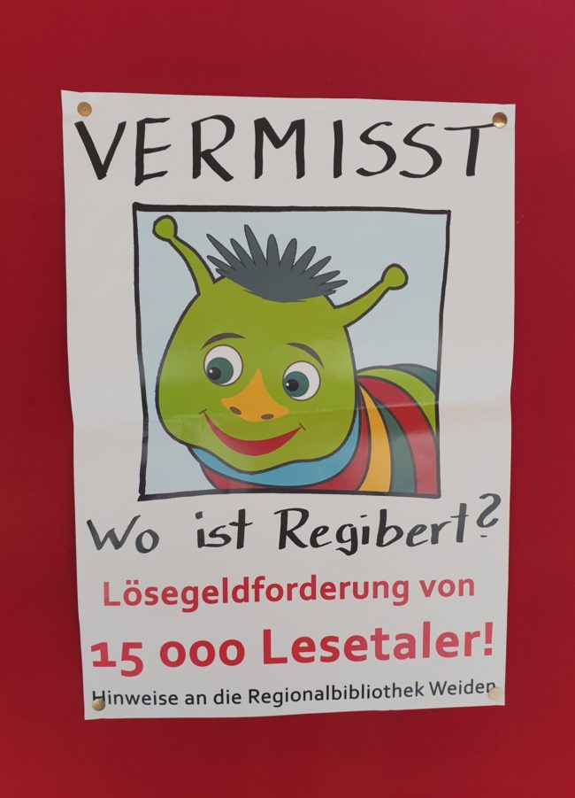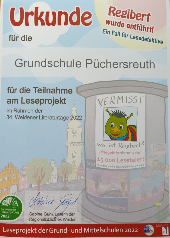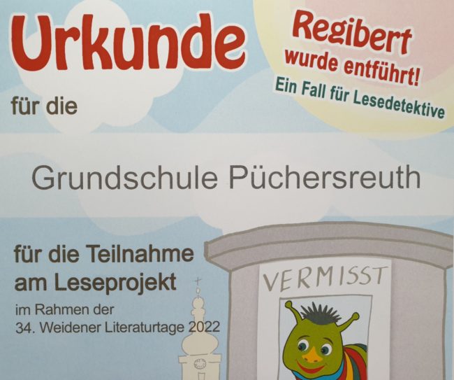 REGIBERT IST FREI Regibert, die Leseraupe der Regionalbibliothek, wurde entführt. Ein Fall für Lesedetektive! Der Erpresser fordert 15.000 Lesetaler Lösegeld. Diese Nachricht animierte über 4000 Schüler im Schulamtsbezirk Neustadt/Weiden, viele Bücher zu lesen, um die geforderten Lesetaler für Regibert zu „erlesen“. Wir haben es geschafft! Regibert ist frei! Die Kinder der Grundschule Püchersreuth haben insgesamt…