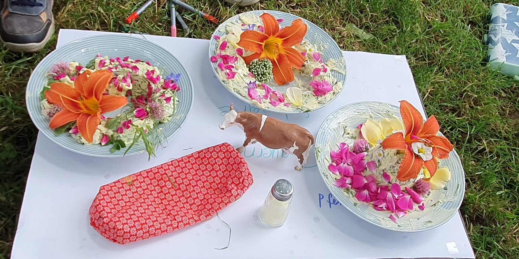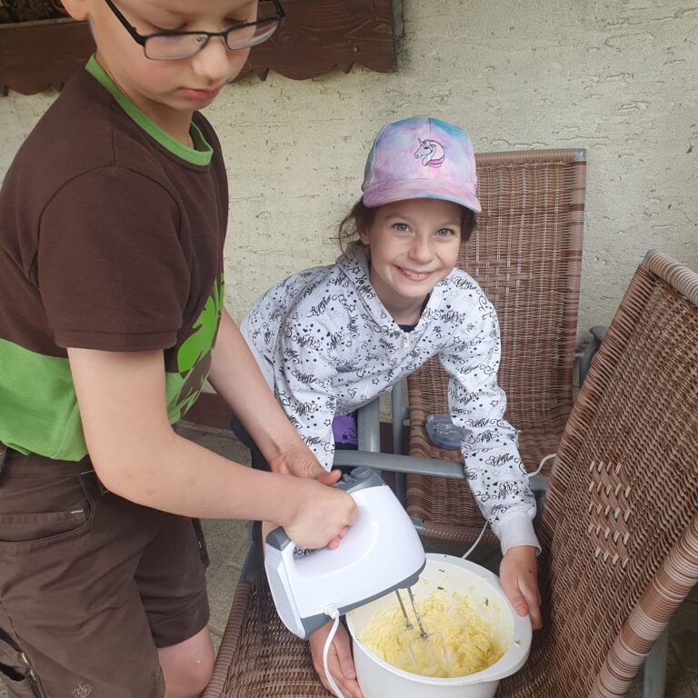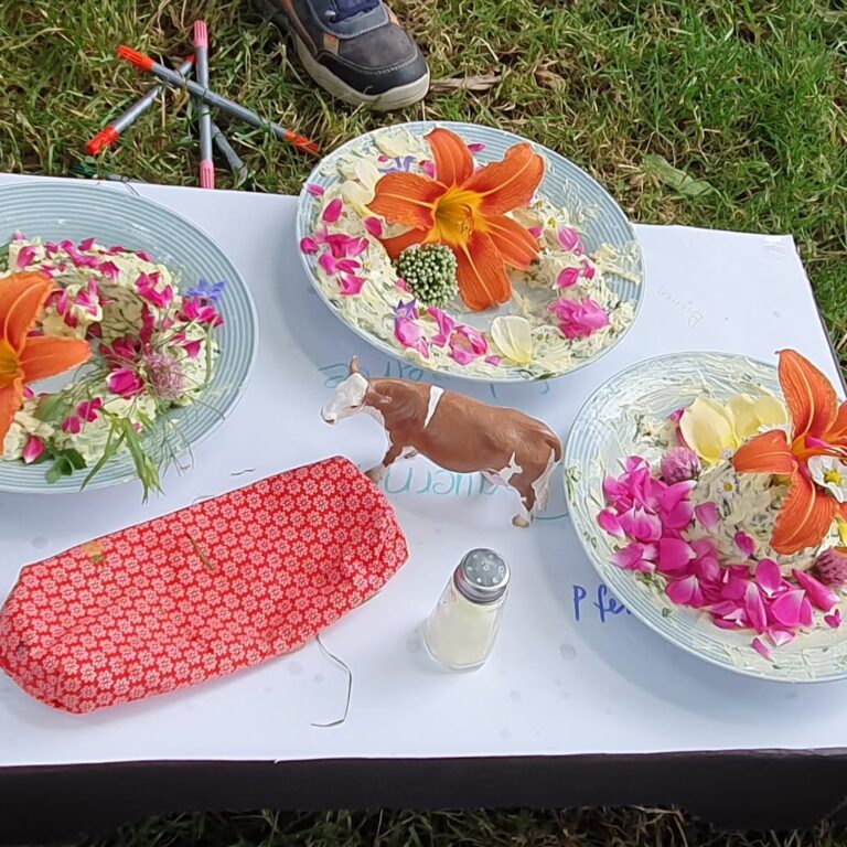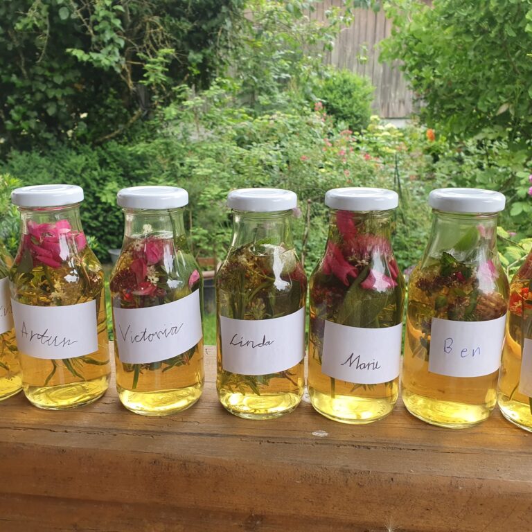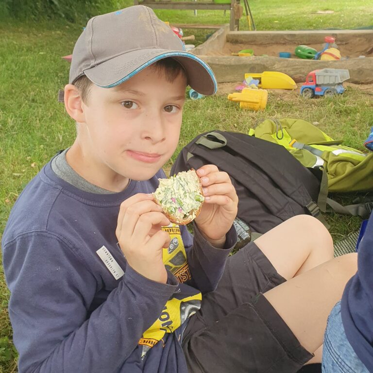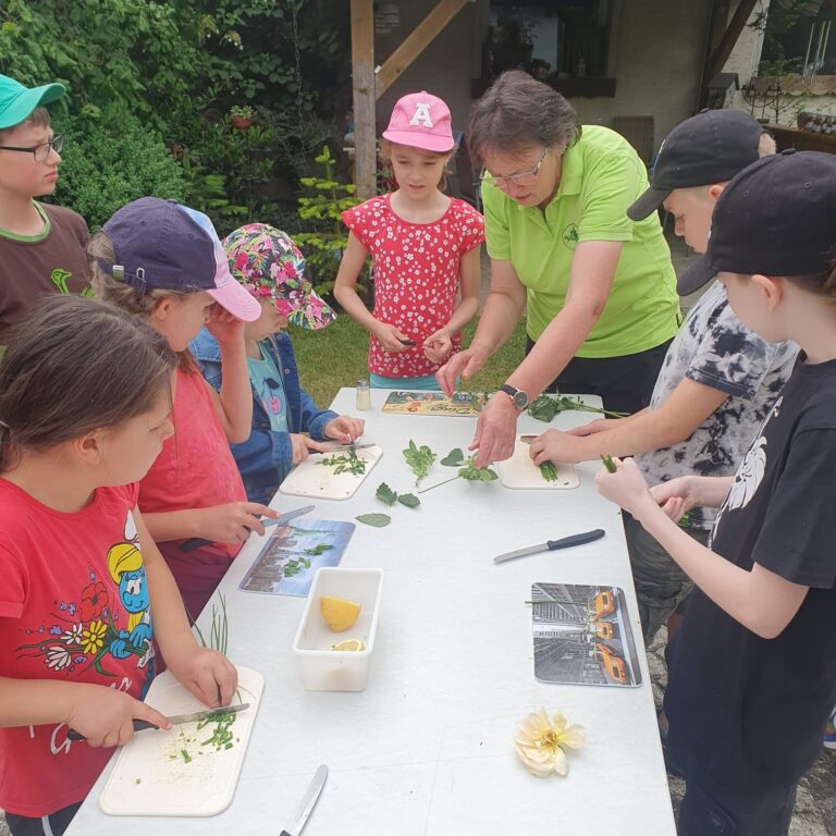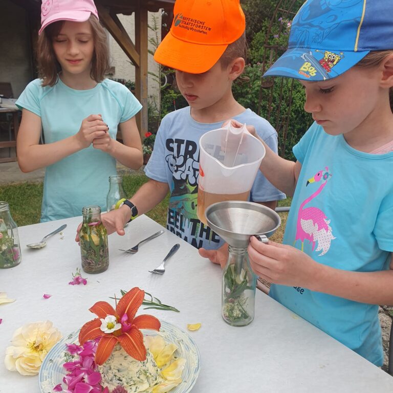 Annelies Oma Anita ist gelernte Kräuterpädagogin und hat mit den Kindern leckere Kräuterbutter und Kräuteressig hergestellt. Beides wurde begeistert mit essbaren Früchten dekoriert. Natürlich musste die Kräuterbutter sofort mit frischem Brot probiert werden und fand allgemeine Zustimmung.