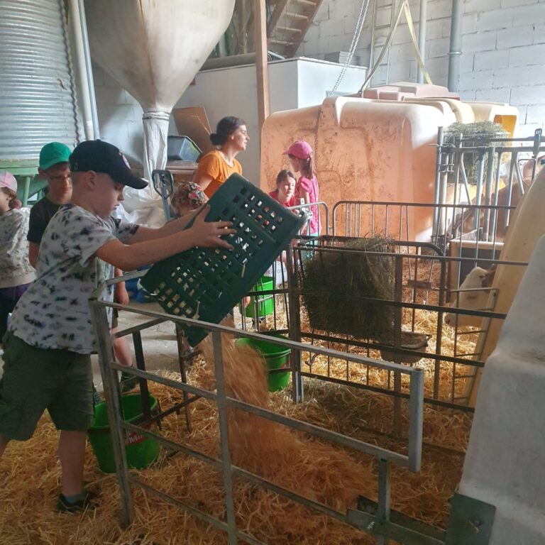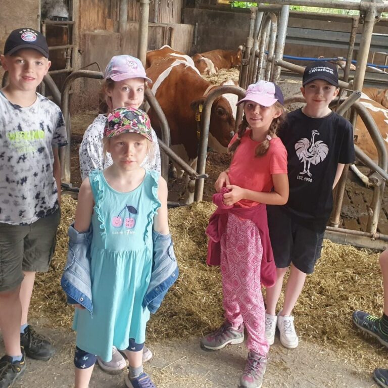 Zuerst erzählte uns ihre Mutter, welche Arten von Bauernhöfen es gibt und dass sie sich auf die Viehhaltung von Milchkühen spezialisiert haben. Natürlich wurden dann die Ställe, Kühe und Kälbchen besichtigt, wobei die Schüler und Schülerinnen fleißig beim Füttern helfen durften.