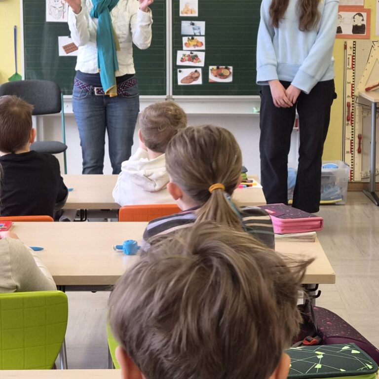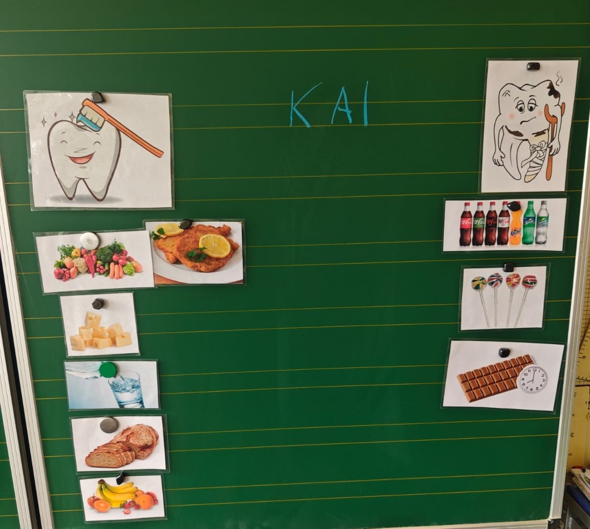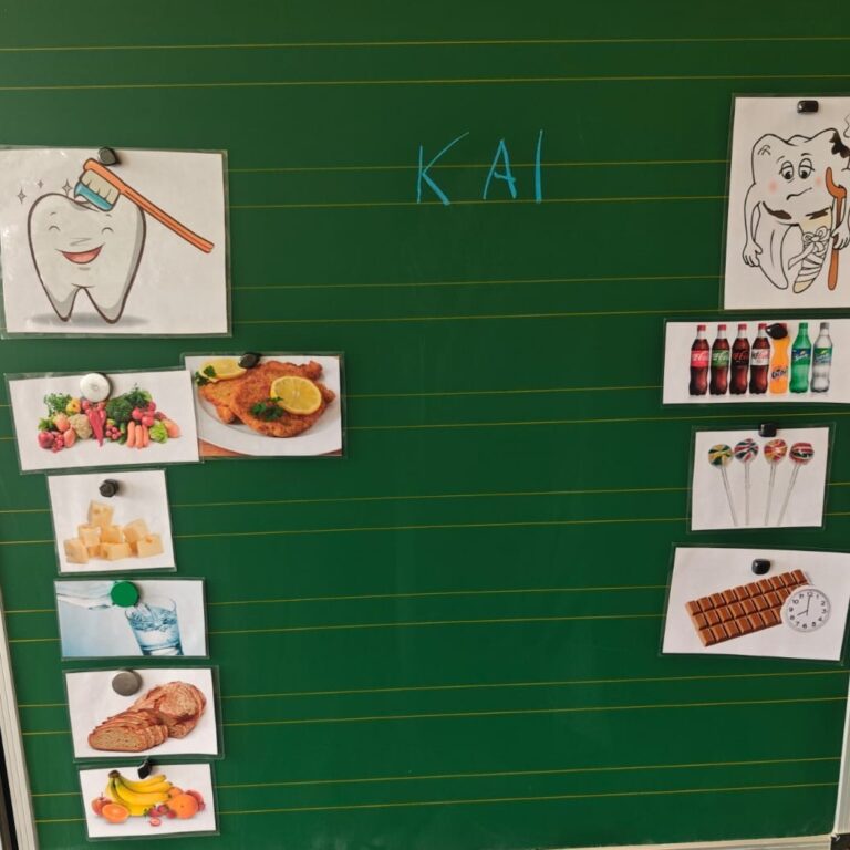 Gemeinsam erarbeiteten die Schülerinnen und Schüler, welche Lebensmittel gut für die Zähne sind und welche ihnen eher schaden. Mit viel Interesse brachten die Kinder ihr Vorwissen ein und lernten gleichzeitig neue Dinge dazu. Besonders anschaulich wurde erklärt, warum zuckerhaltige Snacks und Getränke den Zähnen schaden können und welche Alternativen empfehlenswert sind.