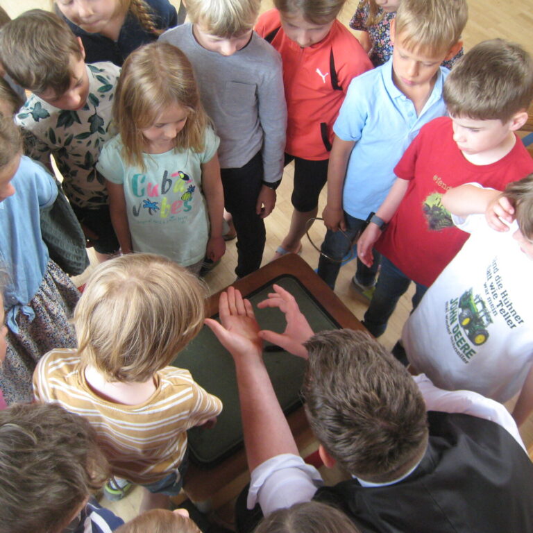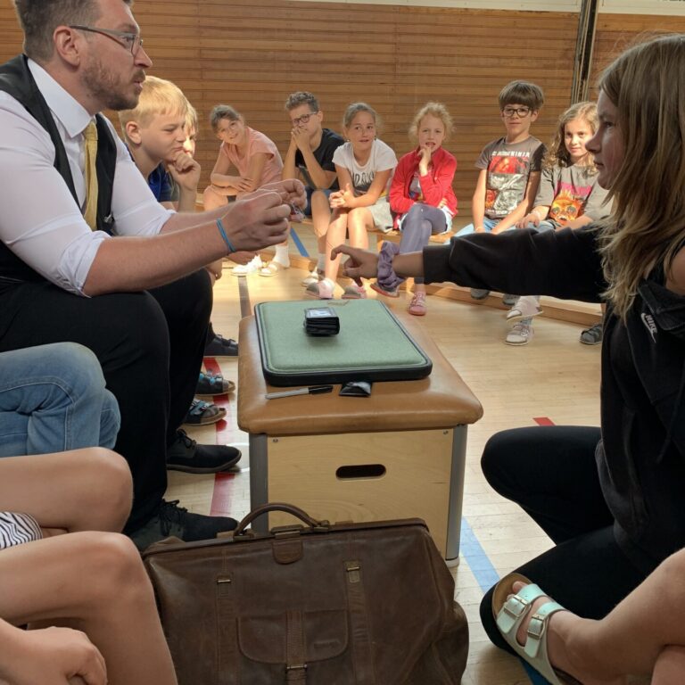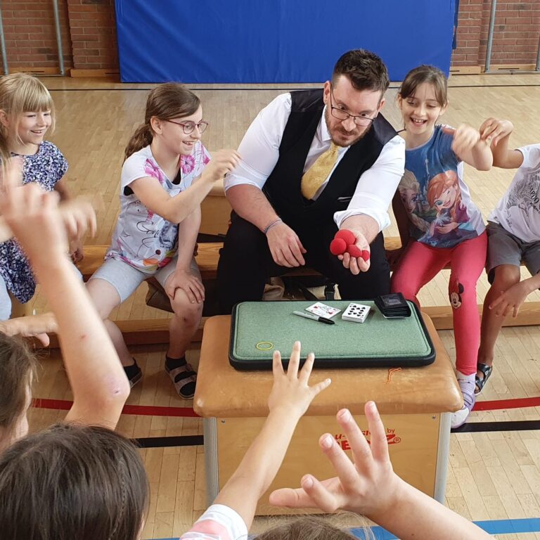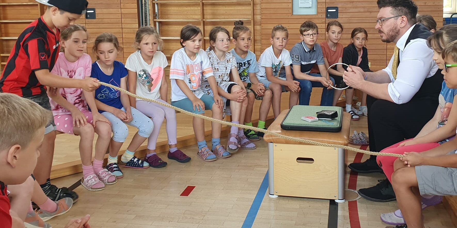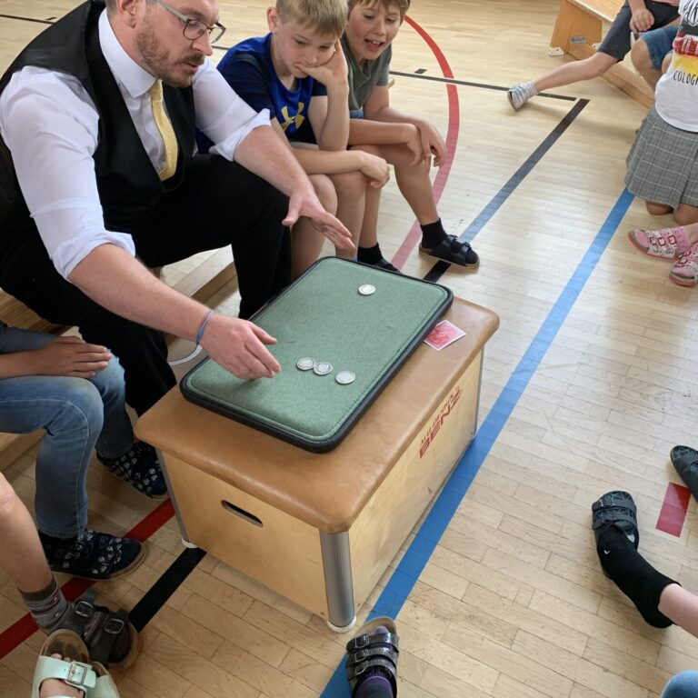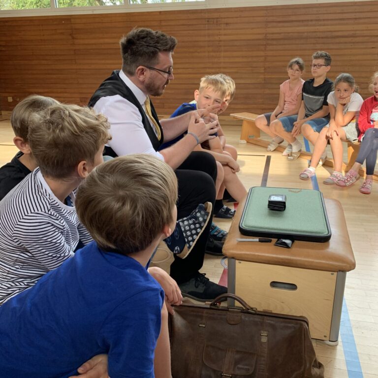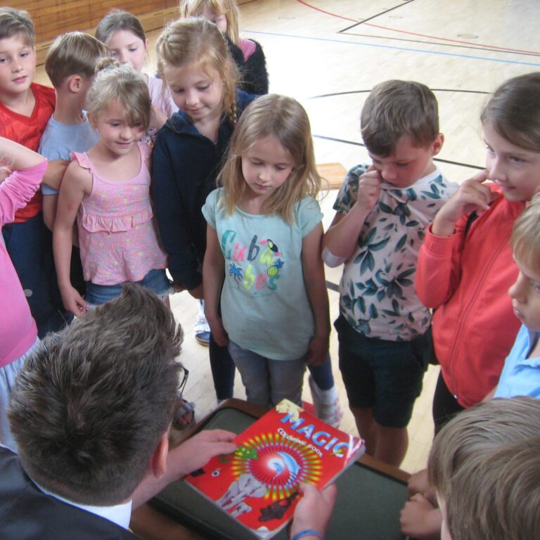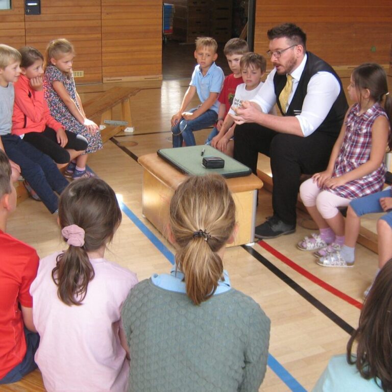 Heute besuchte Magier Marco Knott aus Bärnau die Schüler und Schülerinnen unserer Grundschule. Dafür war er von seinem magischen Schlosstheater aus Bärnau angereist.
