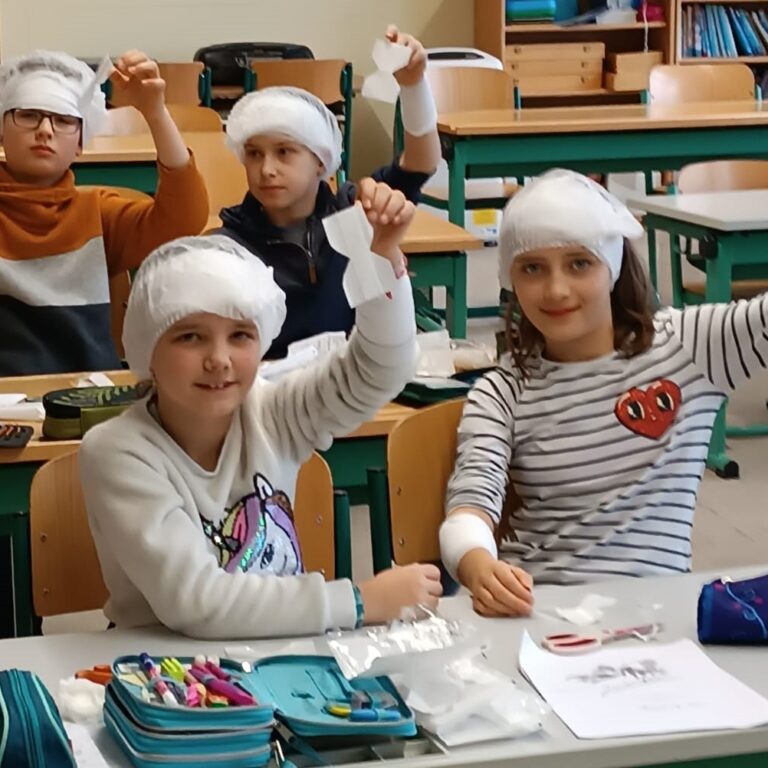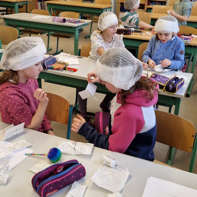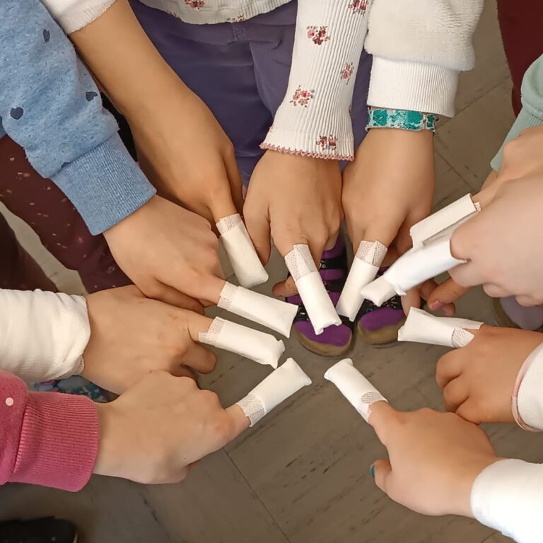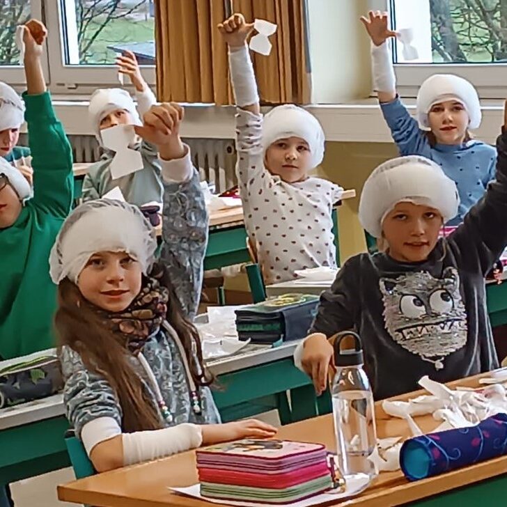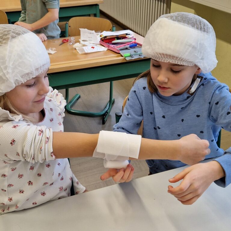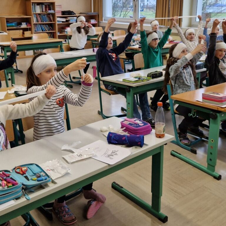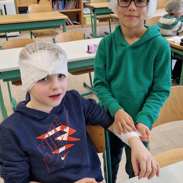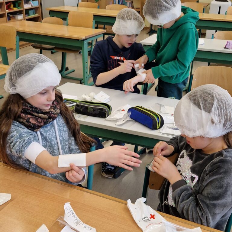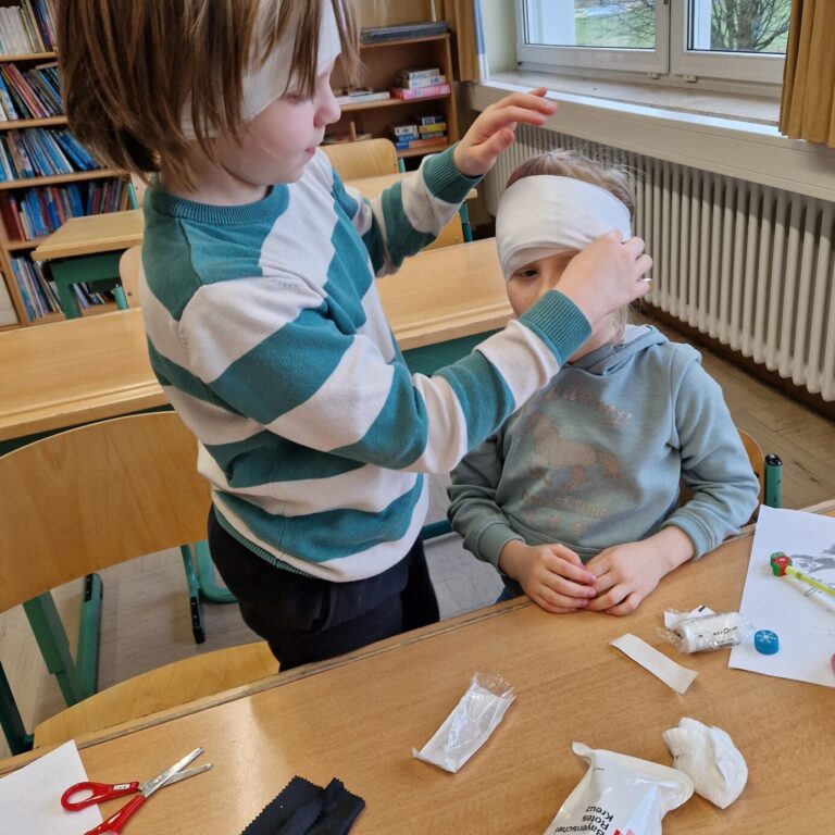 Motiviert und mit Verbandsmaterial gut gerüstet, ging man ans Werk. Unter fachkundiger Anleitung erfuhren sie an diesem Vormittag, wie eine kleine Wunde richtig versorgt werden kann, wie ein Verband oder ein Pflaster anlegt wird und wie man bei Bauchschmerzen, einer Kopfverletzung usw. handelt. Besonders die Kopfverbände machten großen Spaß.