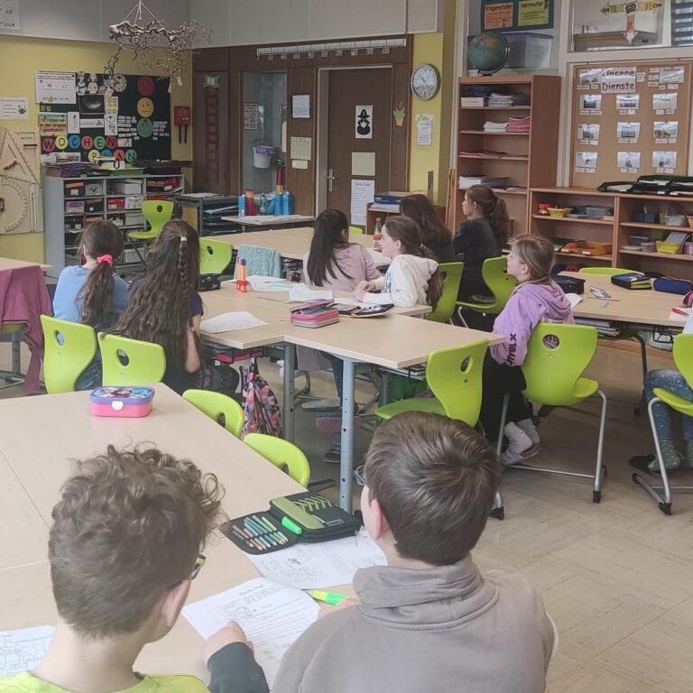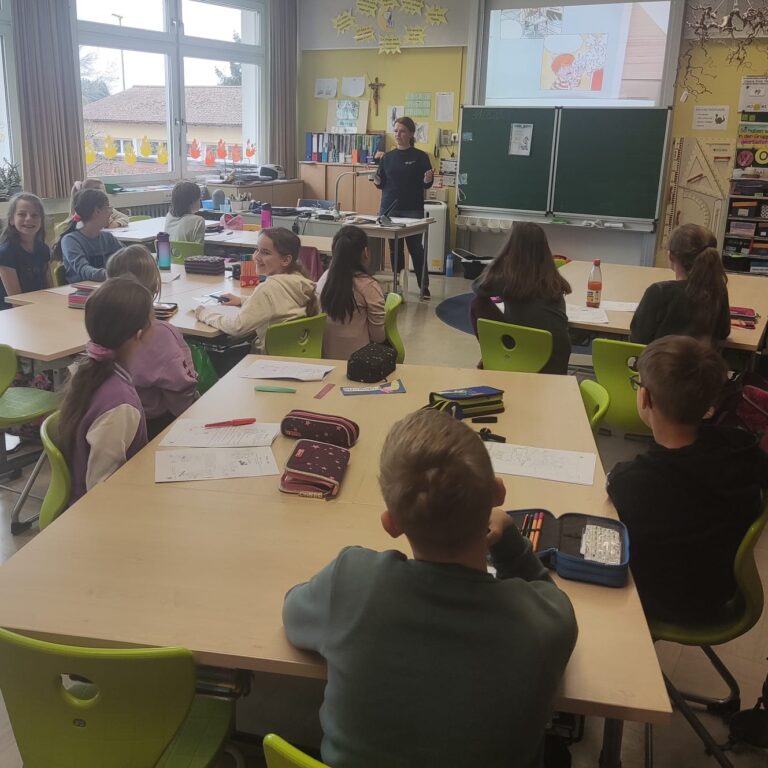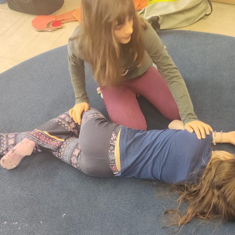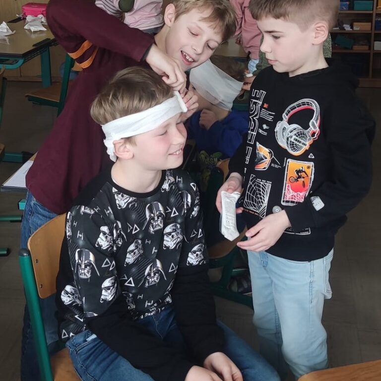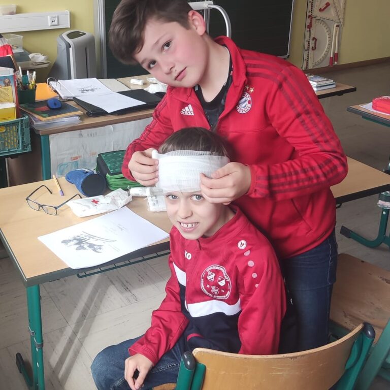 Neben einem sehr lehrreichen und interessanten Theorieteil lernten die Schüler wie man sich um Verletzte kümmert, einen Verband oder ein Pflaster anlegt und wie man bei Bauchschmerzen, einer Kopfverletzung usw. handelt. Wie die stabile Seitenlage durchgeführt wird und auch was im Notfall zu beachten ist, war an diesen beiden Vormittagen Thema. Es wurde viel geübt und sofort in die „Praxis“ umgesetzt.