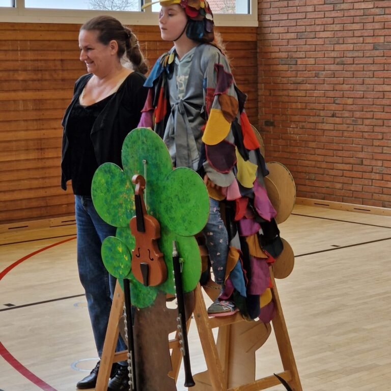 Von Anfang an wurden alle Anwesenden aktiv in die musikalische Erzählung eingebunden. Ausgewählte freiwillige Kinder durften nach Anleitung gemeinsam die Kulissen aufbauen, was für große Begeisterung sorgte und den Kindern nebenbei die Elemente eines Bühnenbildes näherbrachte. Im Anschluss daran wurde eine Schülerin zur Tonmeisterin ernannt, die sich während der gesamten Aufführung professionell um das „Orchester“ kümmerte. Doch bevor das musikalische Märchen aufgeführt wurde, wurden alle Instrumente und die dazugehörenden Figuren mit ihrem musikalischen Thema vorgestellt. Dabei konnten alle Kinder mit Hilfe der beiden Profis in die Rolle des Vogels, der Katze, der Ente, des Wolfes, des Peters, des Großvaters und der Jäger schlüpfen. Die Begeisterung war groß und die Kinder gespannt, gebannt und fasziniert.