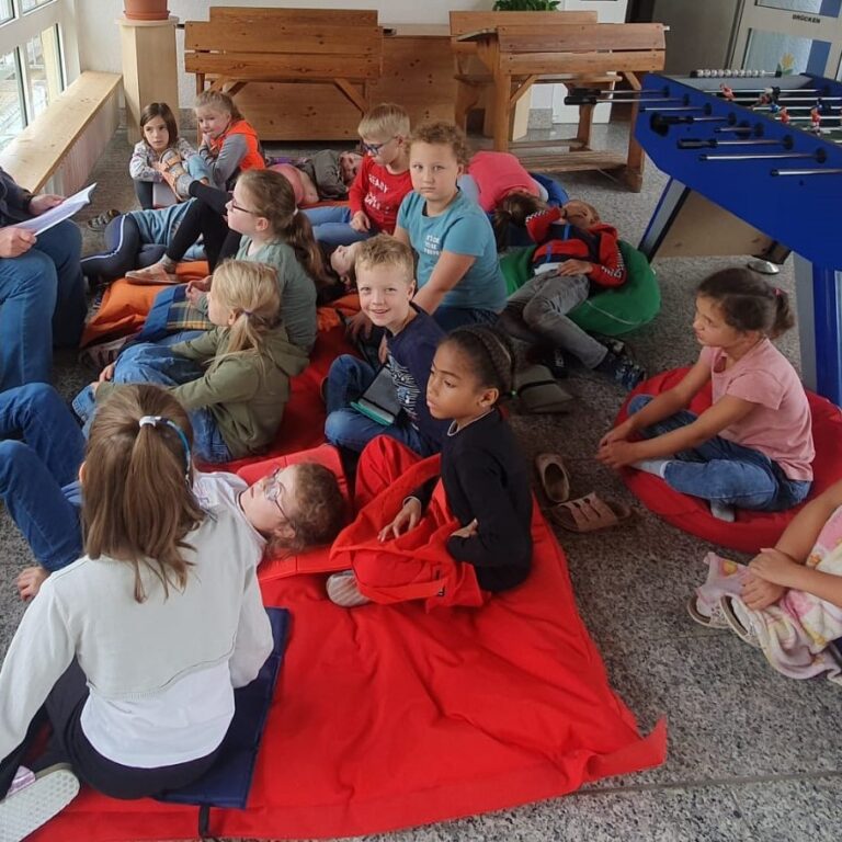 Leider mussten aufgrund des schlechten Wetters die verschiedenen Stationen in das Schulgebäude verlagert werden. Dennoch hatten die Kinder großen Spaß und lauschten gespannt und aufmerksam den Geschichten von Räubern, Zauberern, Drachen usw., die ihnen von den Lehrkräften vorgelesen wurden.