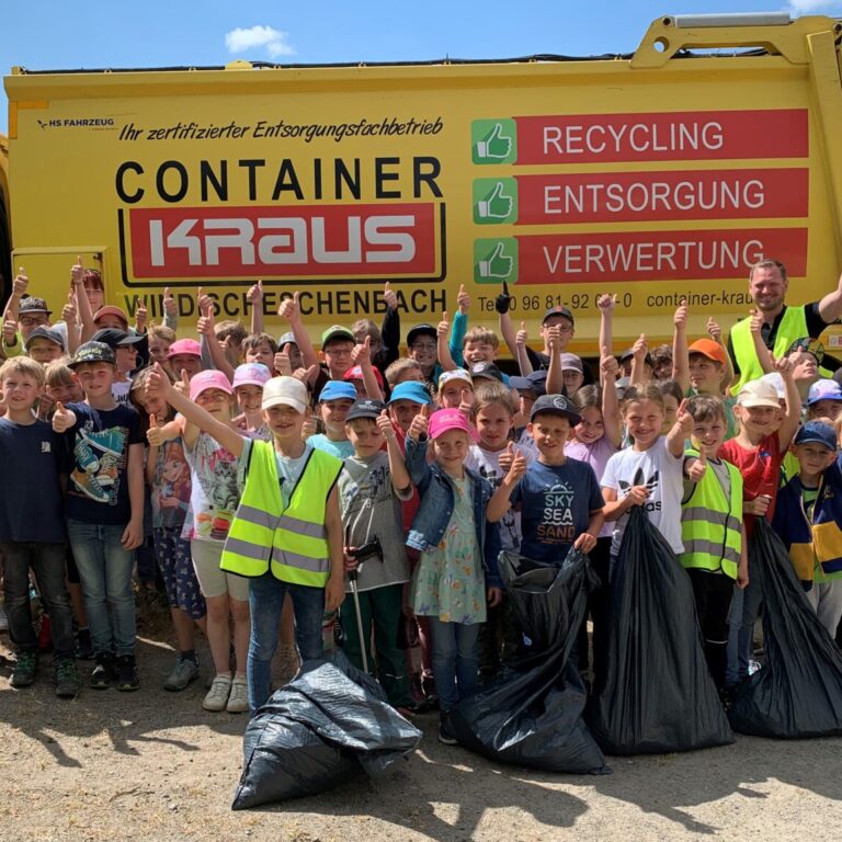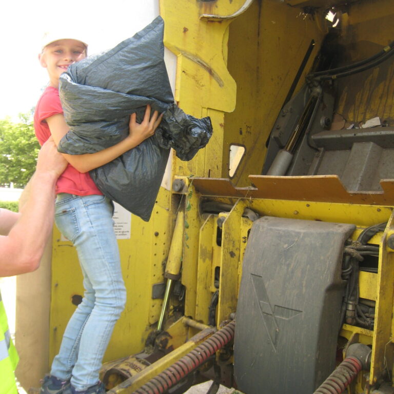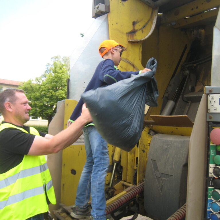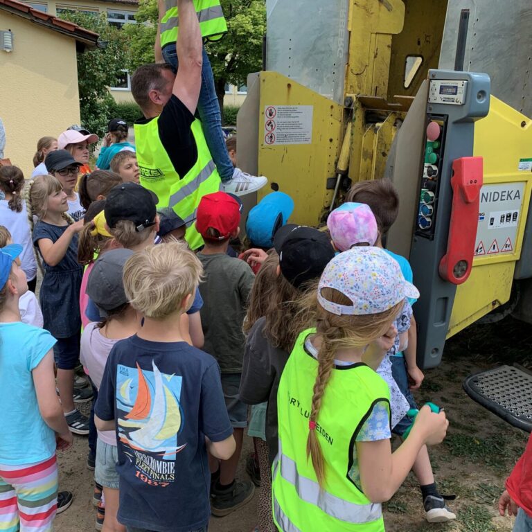 Die Aktion endete wieder im Pausenhof, wo der gesammelte Müll aufgestapelt wurde. Dieser wurde anschließend von einem Mitarbeiter des Müllunternehmens Kraus ordnungsgemäß abtransportiert. Natürlich hatten die Kinder große Freude, als sie zuvor noch einen Blick in das Innere des Müllwagens werfen durften.