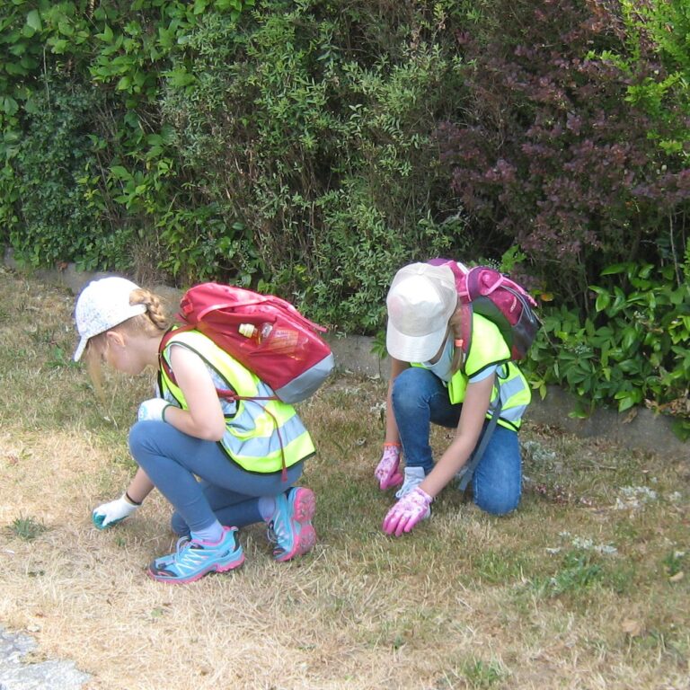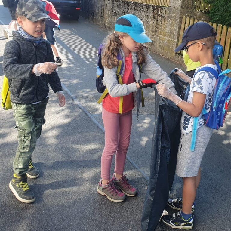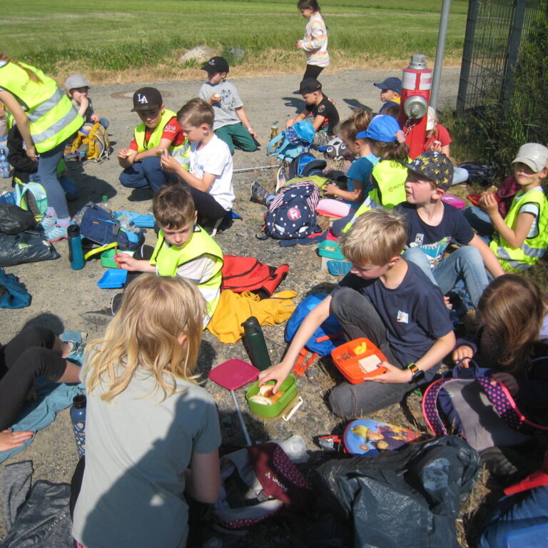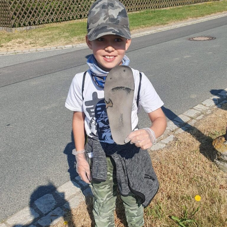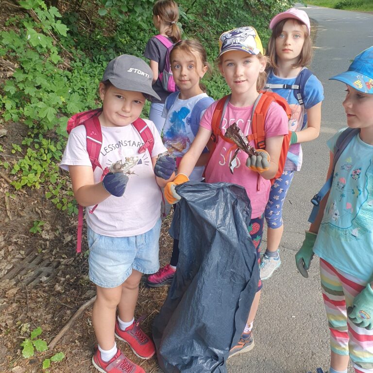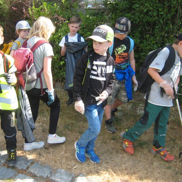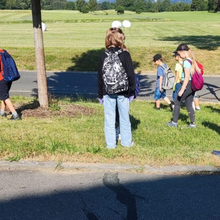 Nun machten sich die einzelnen Klassen begleitet von ihren Lernkräften und den Helfern mit Handschuhen, Warnwesten, Müllgreifern und Müllsäcken ausgerüstet auf den Weg. Lange dauerte es zwar nicht, bis der erste Müll in die Säcke wanderte, aber erfreulicherweise konnten alle Gruppen feststellen, dass sich die Ausbeute von Müll in ihrem Ort in Grenzen hielt. Dennoch waren die Kinder erstaunt, was da alles so rumlag und in der Natur entsorgt und zurückgelassen wurde. Vor allem Verpackungen von Bonbons, Kartonagen, leere Zigarettenschachteln, Zigarettenkippen, Kronkorken und Plastiktüten waren zu finden. Aber auch Getränkeflaschen, Schuhsohlen und Badeschlappen wurden einfach neben der Straße entsorgt.