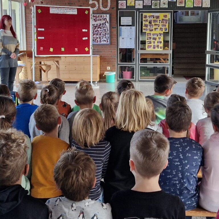 Während unserer heutigen Schulversammlung in der Pausenhalle wurden die neuen Sozialziele sehr eindrucksvoll von den Kindern der 4. Klasse in einem Rollenspiel vorgestellt. Unter der Leitung ihrer Klassenlehrerin Frau Rudloff demonstrierten die Schülerinnen und Schüler uns allen wie bedeutsam das Grüßen jeder Person im Schulhaus mit Blickkontakt, einem freundlichen Gesichtsausdruck und einem Lächeln ist. Die Beispiele für Höflichkeit, Hilfsbereitschaft und Rücksichtnahme wurden von den Kindern sofort als sehr wichtig für ein gutes Zusammenleben in der Schule erkannt. Das richtige Verhalten im Schulhaus – langsam und vorsichtig gehen, in Zimmerlautstärke auf den Gängen sprechen, achtsam mit der Schulhausdekoration umgehen usw. – wurde durch die Viertklässler sehr wirksam dargestellt. Vielen Dank!