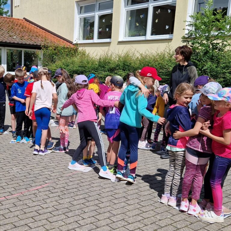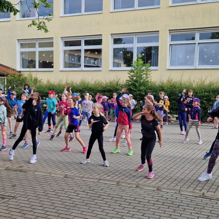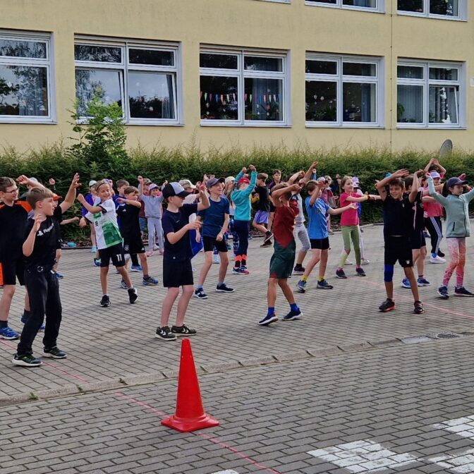 Bei bestem Wetter und zu rhythmischer Musik gab es auf dem Pausenhof zunächst ein abwechslungsreiches Aufwärmprogramm mit einem Tanz und gymnastischen Übungen, durchgeführt von unserer Sportbeauftragten Frau Sabine Rudloff.