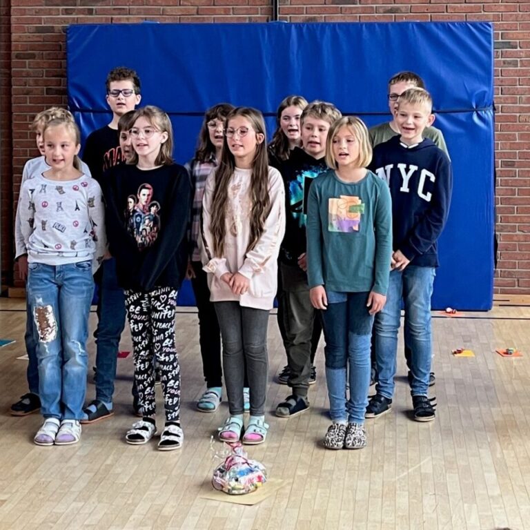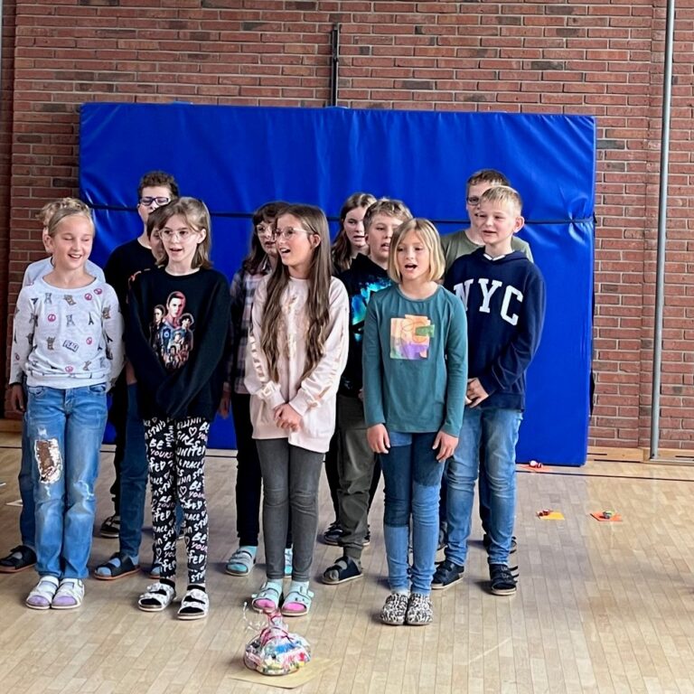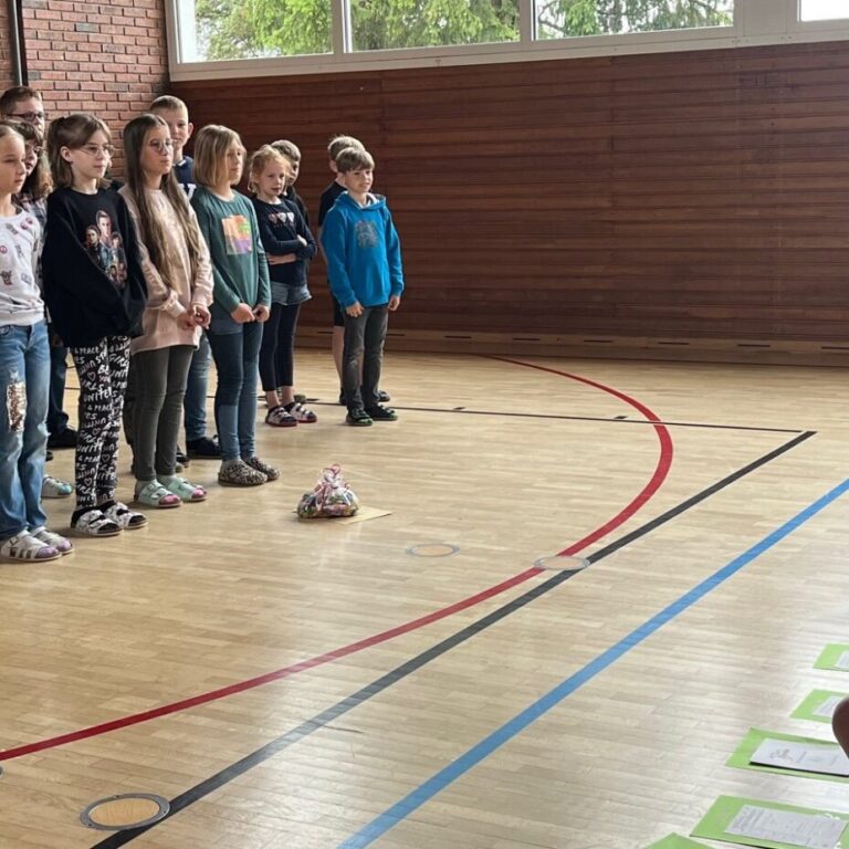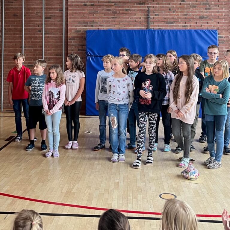 Deshalb versammelten sich alle Schülerinnen, Schüler und Lehrerinnen am letzten Schultag des Schuljahres für die Verabschiedung der Viertklasskinder in der Turnhalle.
