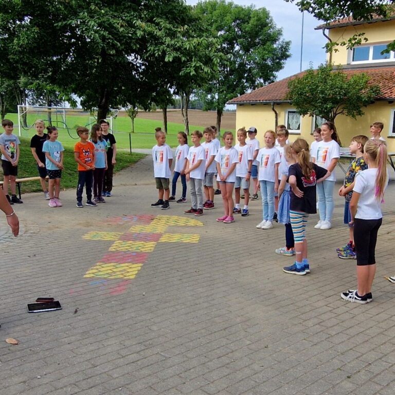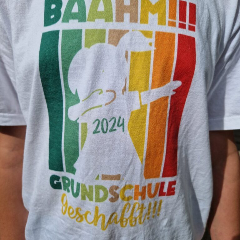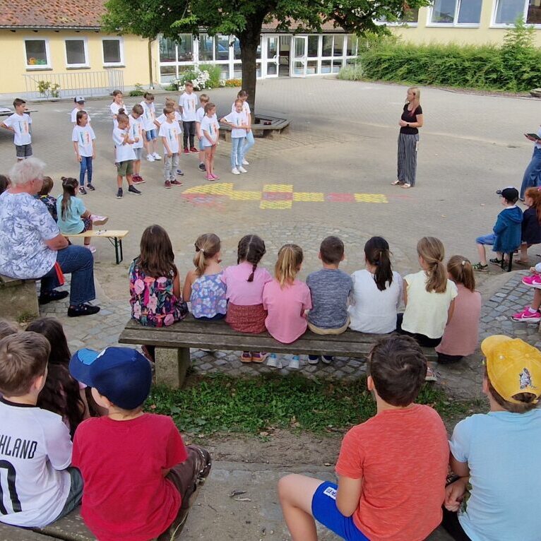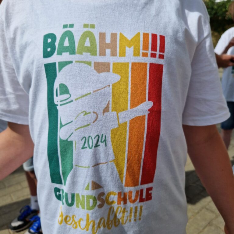 Gleich zu Beginn wurden wir von den Kindern der 4. Klasse überrascht. Sie alle liefen in einem tollen Abschluss – T-Shirt auf dem Pausenhof ein.