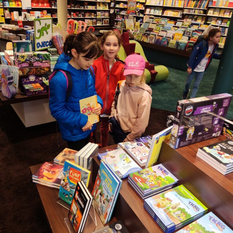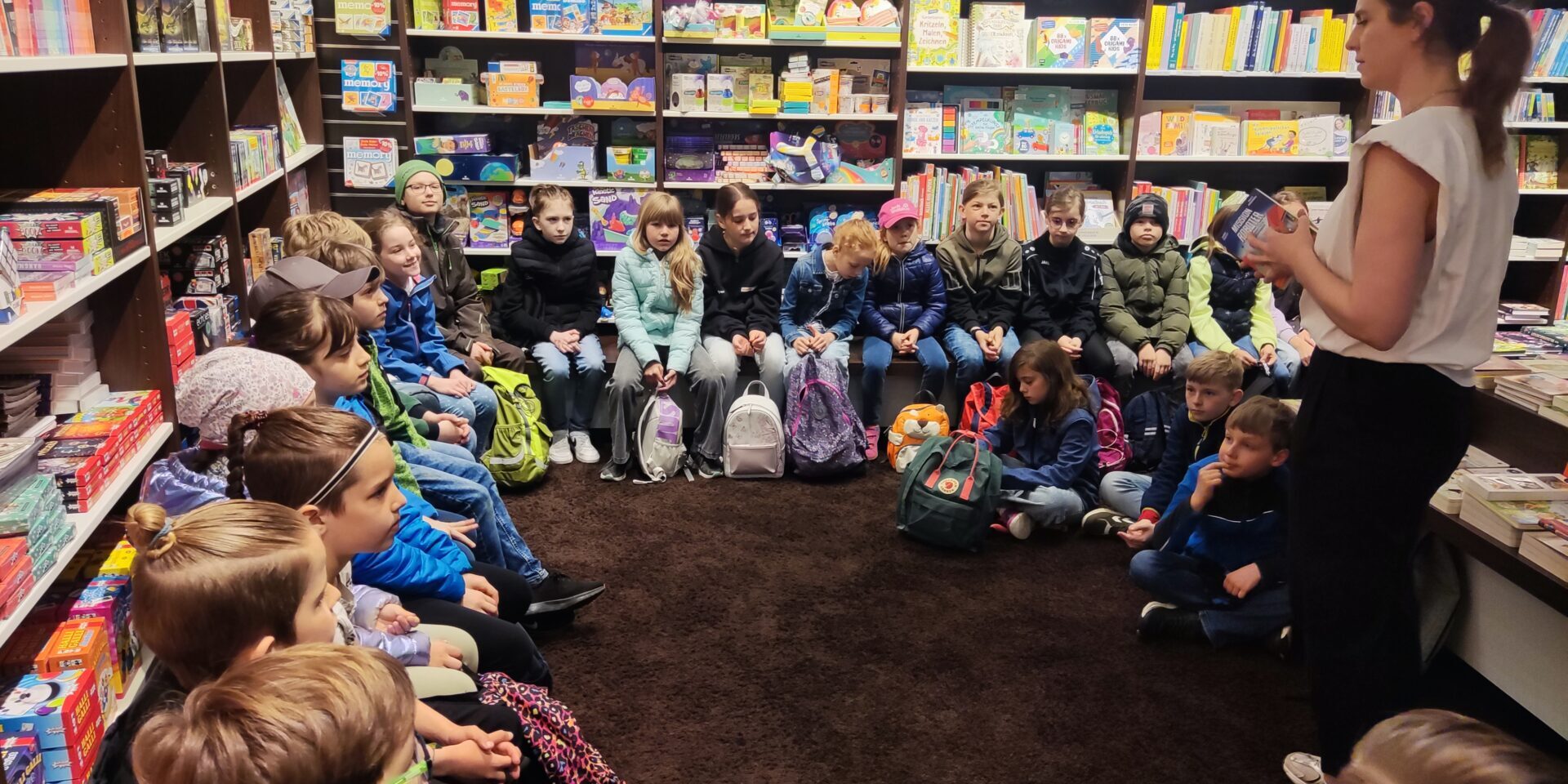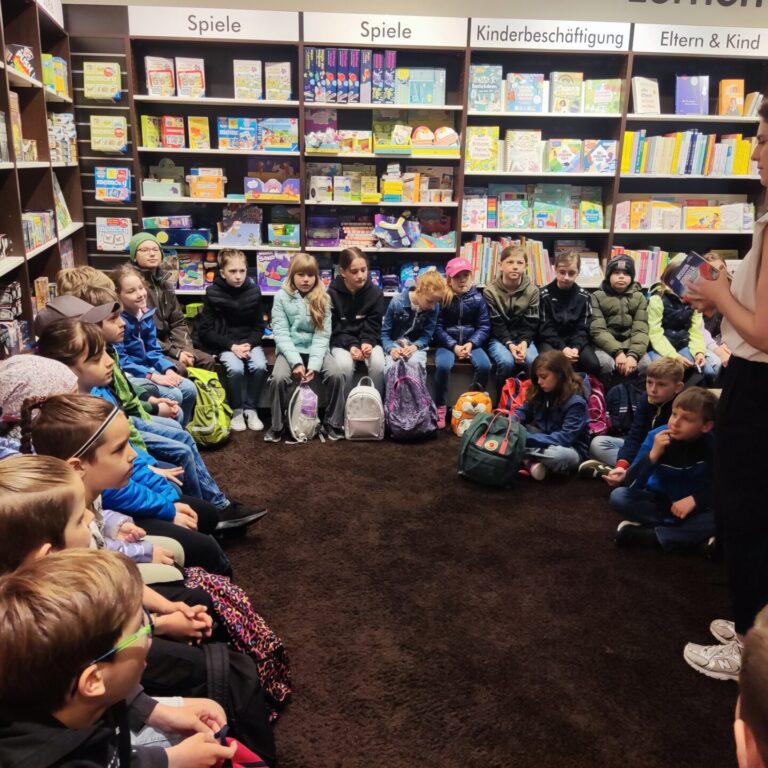 In einem sehr kurzweiligen und interessanten Vortag brachte die Buchhändlerin Frau Schmucker den Kindern ihren Beruf und momentan angesagte und gefragte Kinderbücher näher. Sie fesselte die Schüler und Schülerinnen mit Rätseln und Denkaufgaben und war begeistert von dem breiten Fachwissen der Klasse über Kinderliteratur. Danach durften die Kinder noch die Buchhandlung auf eigene Faust erkunden und in den neuesten Büchern schmökern. Zuletzt beschenkte Frau Schmucker alle fleißigen Leser und Leserinnen mit einem eigenen Exemplar des Buches „Mission Roboter – Ein spannender Fall für die Glücksagentur“.