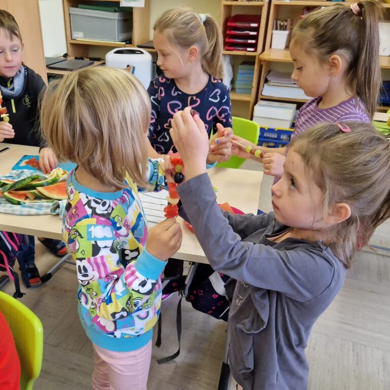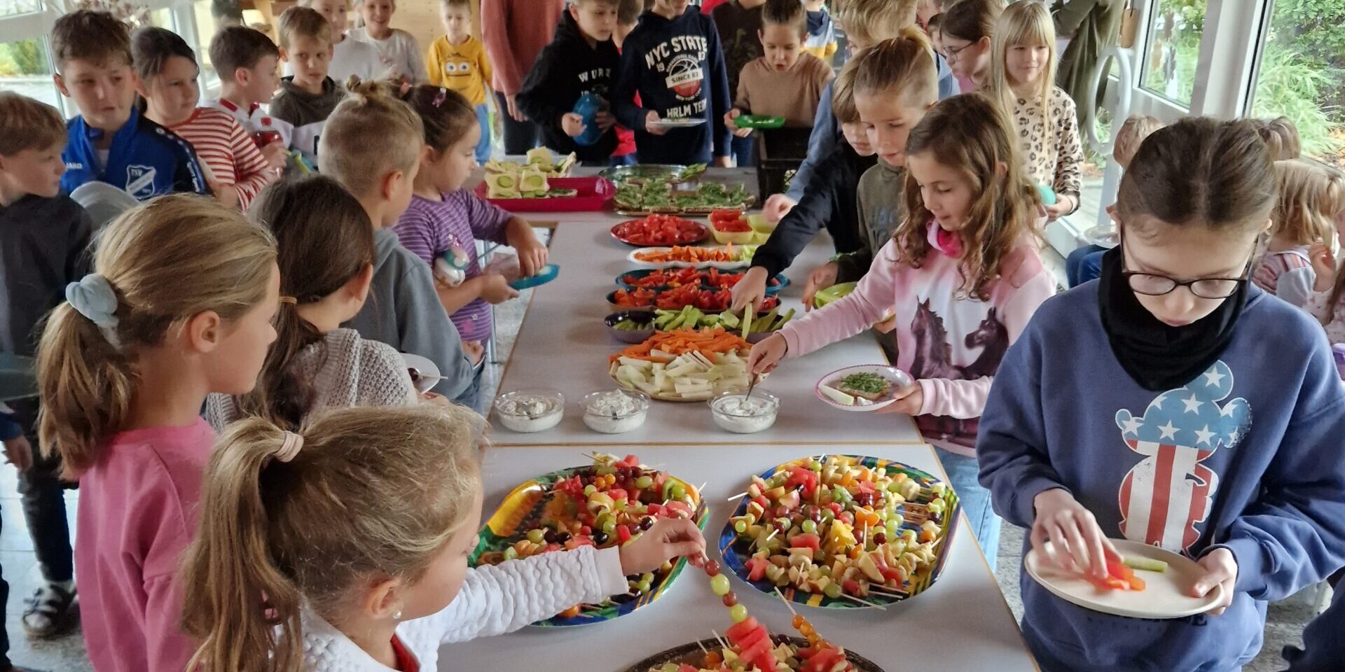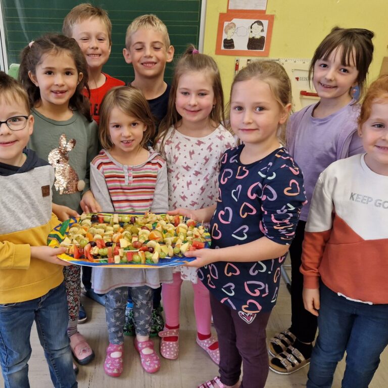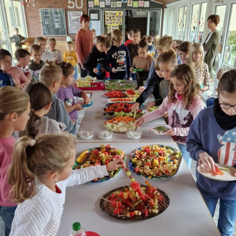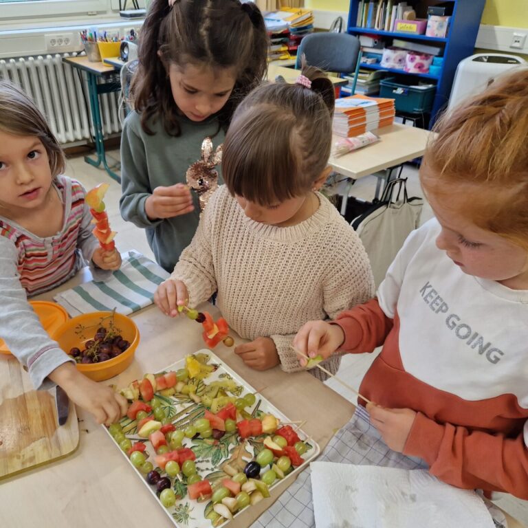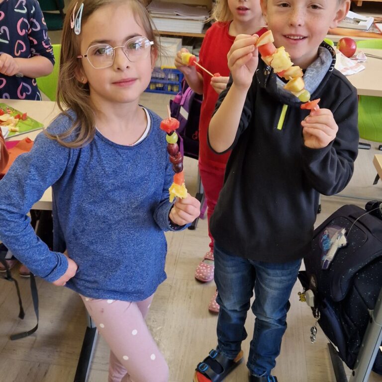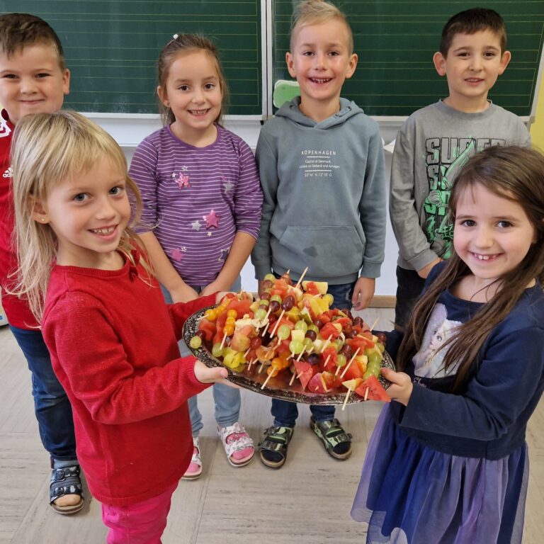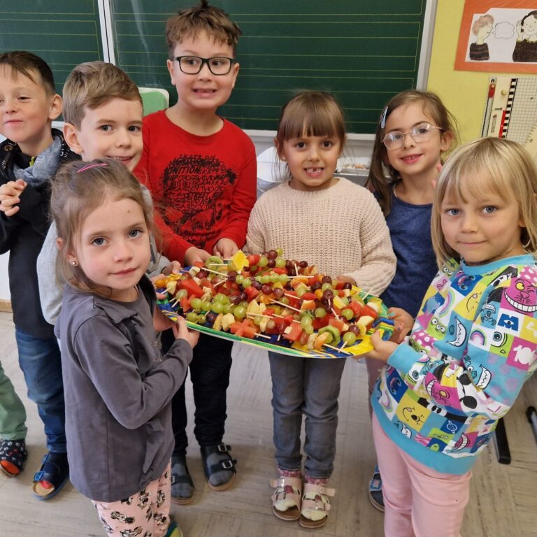 In der Klasse 1 wurden fleißig vitaminreiche Sorten Obst geschnitten. Am Ende lagen zahlreiche, bunte Obstspieße auf den Platten. So macht gesundes Essen Spaß!