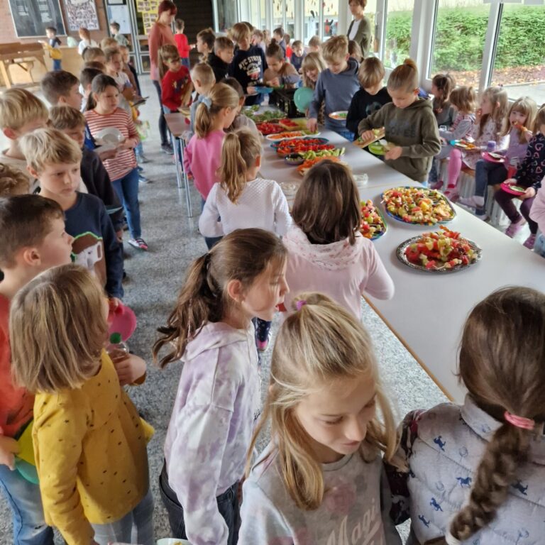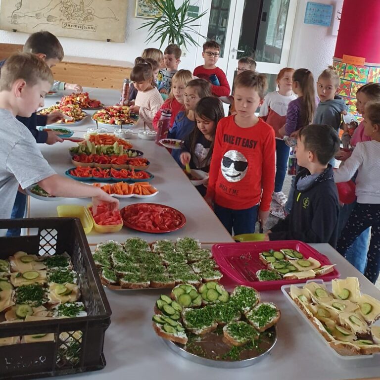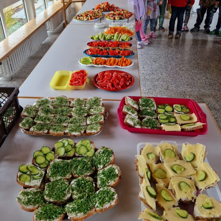 Für die Kinder aller Klassen stand die gesunde Ernährung in dieser Woche im Mittelpunkt des Unterrichtes und gemeinsam stellten wir ein vielfältiges und vollwertiges Frühstücksbuffet zusammen.